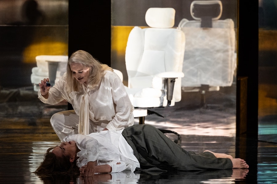 Los decorados exhiben un salón gélido, minimalista; un recinto opresivo que inicialmente parece acogedor, con ciertos motivos florales de estilo nipón y un pavimento de espejo que acentúa su frialdad, con dos taburetes clásicos próximos a la audiencia. Por lo tanto, la carencia de otros componentes y la iluminación helada pretenden reforzar también una atmósfera asfixiante, de enigma, subrayando el fraude y la tensión psicológica.